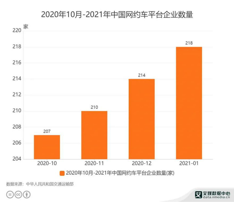 根据艾媒数据显示,2020 年 10 月到 2021 年 1 月,中国网约车平台从 201 家涨到 218 家。网约车行业仍在迎来新玩家。前瞻发布的数据显示,网约车行业规模已经发展至 3044 亿元。