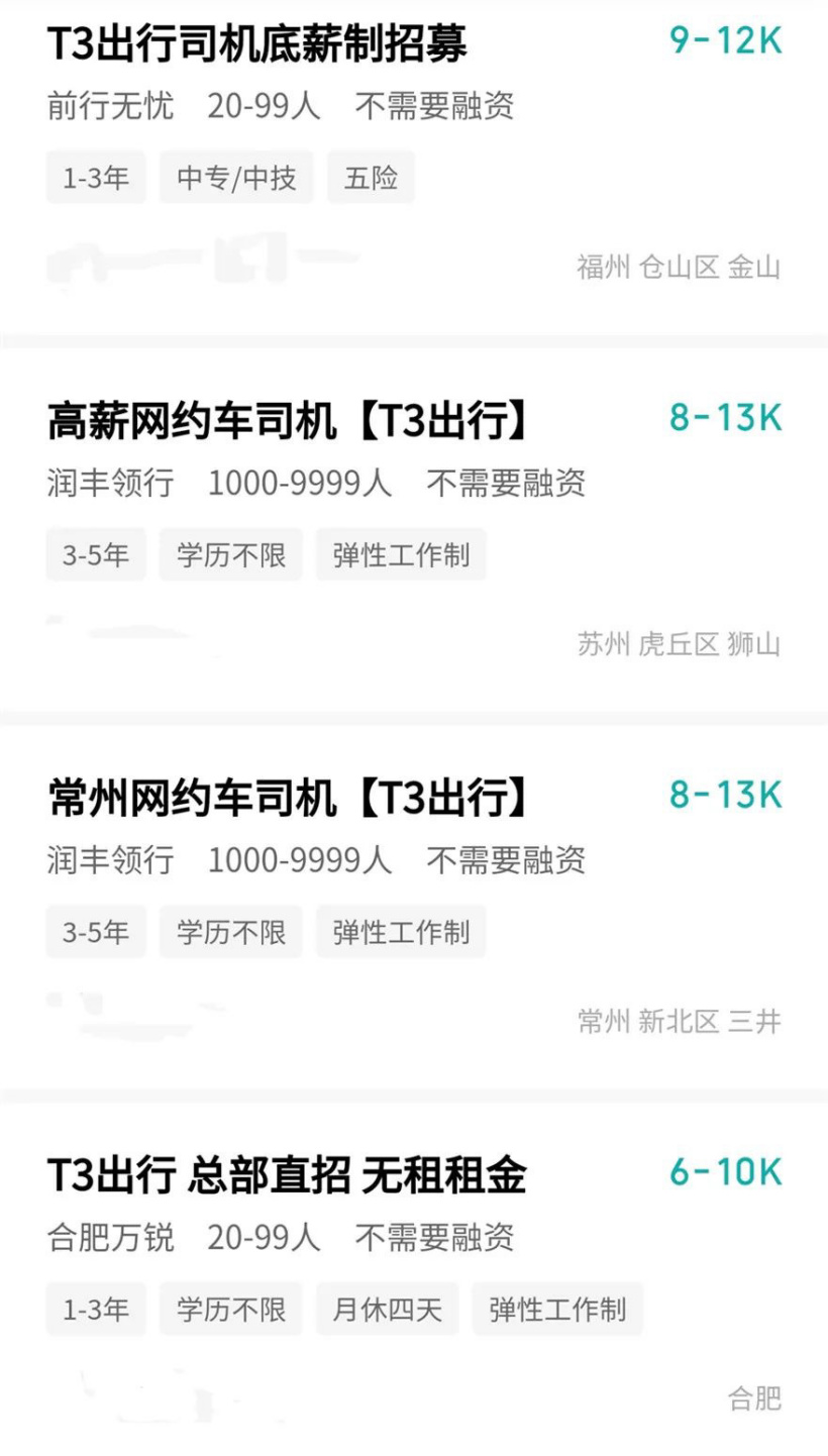 另一面,根据招聘网站显示,T3 出行、曹操出行目前正在招聘网约车司机,在招聘信息最顶端写着高薪二字。