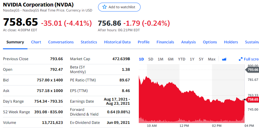 今天常规交易中,英伟达跌 35.01 美元,跌幅为 4.41%,报收于 758.65 美元。这也是英伟达连续第三天下跌,罪魁祸首似乎是加密货币。