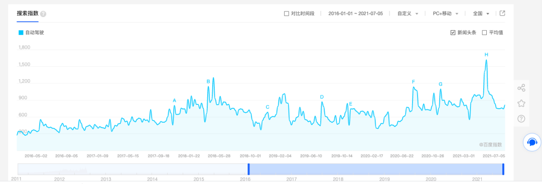 从搜索指数来看,“自动驾驶”在 2018 年达到高位,2019 年在起起伏伏中回落,并在今年再次来到历史高点。