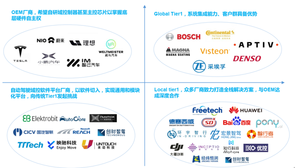 佐思智研将自动驾驶域控制器的玩家分为四类:Global Tier1、Local Tier1、自动驾驶域控软件平台厂商、以及 OEM 厂商。