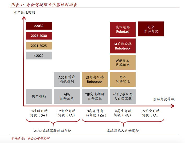 根据中金公司的测算,L4 级无人 Robotruck/Robotaxi 直到 2025-2030 年才开始商业化落地,而 L3 级高速公路有条件自动驾驶、L4 级自主代客泊车、矿区自动驾驶和无人末端配送等场景将在 2025 年前量产落地。
