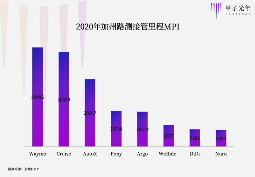 如何评判每家自动驾驶企业的技术高低?根据 2020 年加州车管所的 MPI(Miles Per Intervention,每两次人工干预之间行驶的平均里程数)排名显示如下: