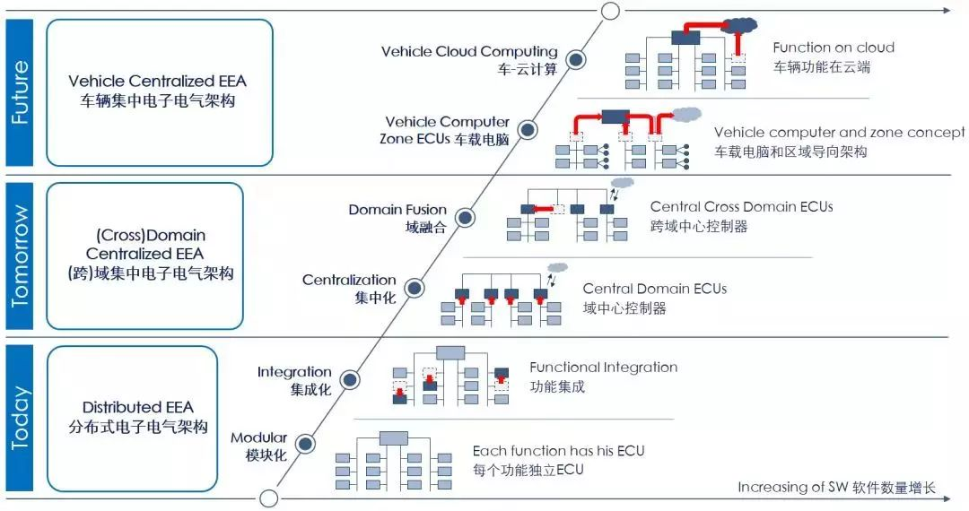而现在,电动汽车用电池、电机、电控系统重构了“汽车”这个概念,汽车变成了装着轮子的电池加底盘。传统的分布式电子电气架构正在快速转变,过去几十上百个分散式的 ECU 骤减为 3~5 个“域控制器”。