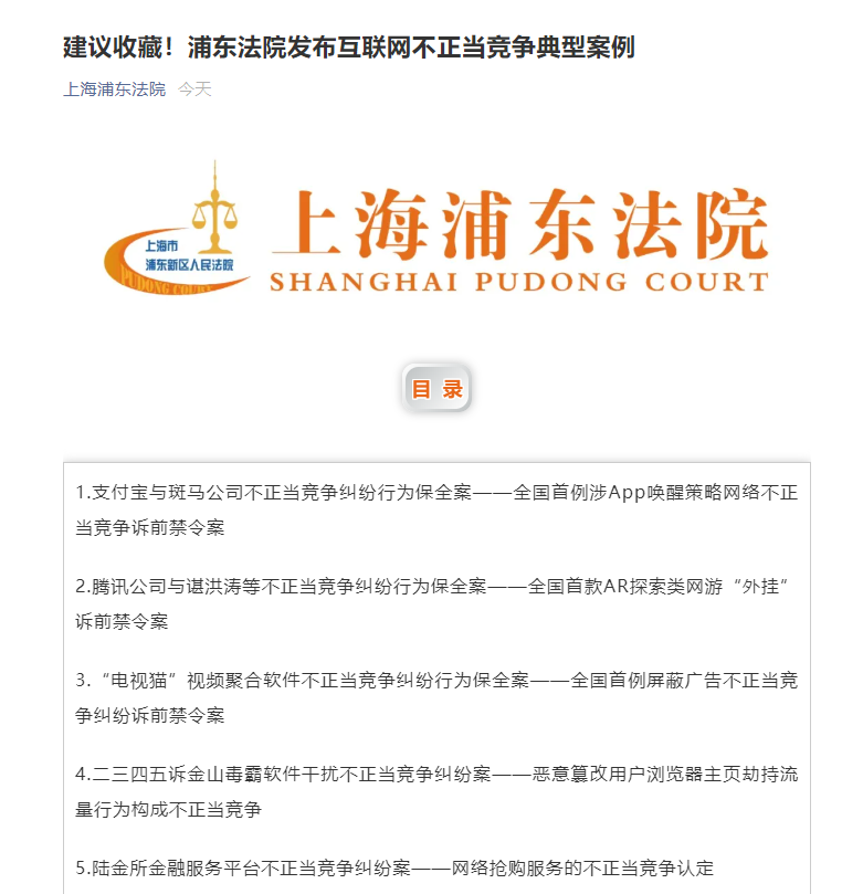 这 10 大互联网不正当竞争典型案例的详情、裁判文书,可以到“上海浦东法院”微信公众号进行浏览。