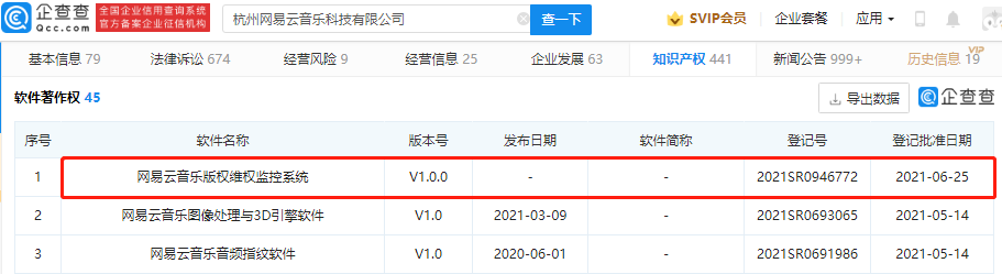 企查查 App 显示,近日,杭州网易云音乐科技有限公司新增一则软件著作权信息,软件全称为网易云音乐版权维权监控系统,版本号 V1.0.0,登记号 2021SR0946772,登记日期则为 2021 年 6 月 25 日。