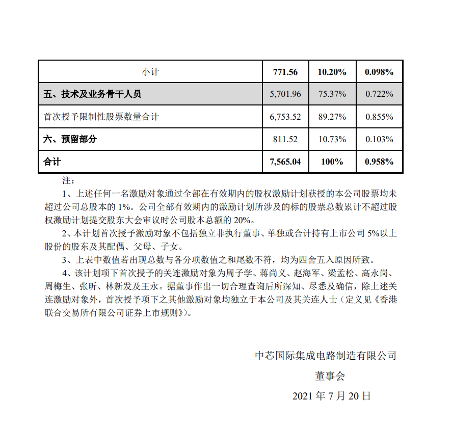 19 日消息 中芯国际 (00981.HK) 今天发布公告表示,公司董事会于 2021 年 7 月 19 日以书面决议形式审议通过了《关于向激励对象首次授予限制性股票的议案》,确定 2021 年 7 月 19 日为授予日,以 20 元/股的授予价格向 3,944 名激励对象授予 6,753.52 万股限制性股票。