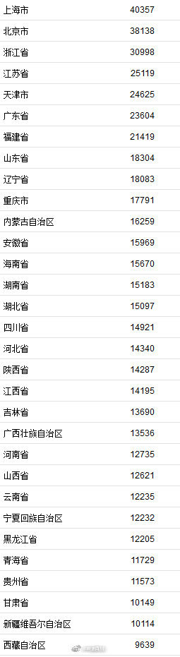 上海首破4万 湖北增超21%】19日下午,国家统计局公布上半年31省份人均可支配收入,上海首次突破4万元大关,再次“摘冠”,另有北京等9省份人均可支配收入超全国平均线。
