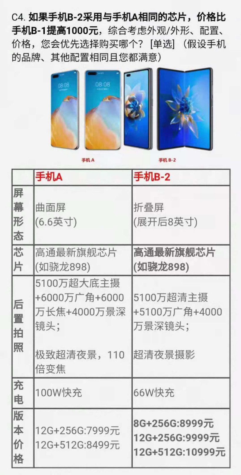 调查问卷 C1 举例道,最新的一批机型 A 将采用 6.6 英寸屏幕,搭载最新的高通骁龙 898 芯片,另一款折叠屏 B-1 则采用骁龙 888 芯片(展开后 8 英寸),大家是否会接受?