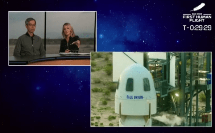 目前,4名机组人员已抵达发射台,并与新谢泼德火箭合影。他们已爬楼梯到达通向新谢泼德火箭的临射休息所,也是安全避难所。