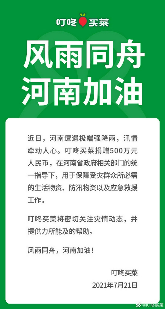 21 日消息 叮咚买菜团购官方微博宣布,近日,河南遭遇极端强降雨。叮咚买菜捐赠 500 万元人民币,在河南省政府相关部门的统一指导下,用于保障受灾群众所必需的生活物资、防汛物资以及应急救援工作。