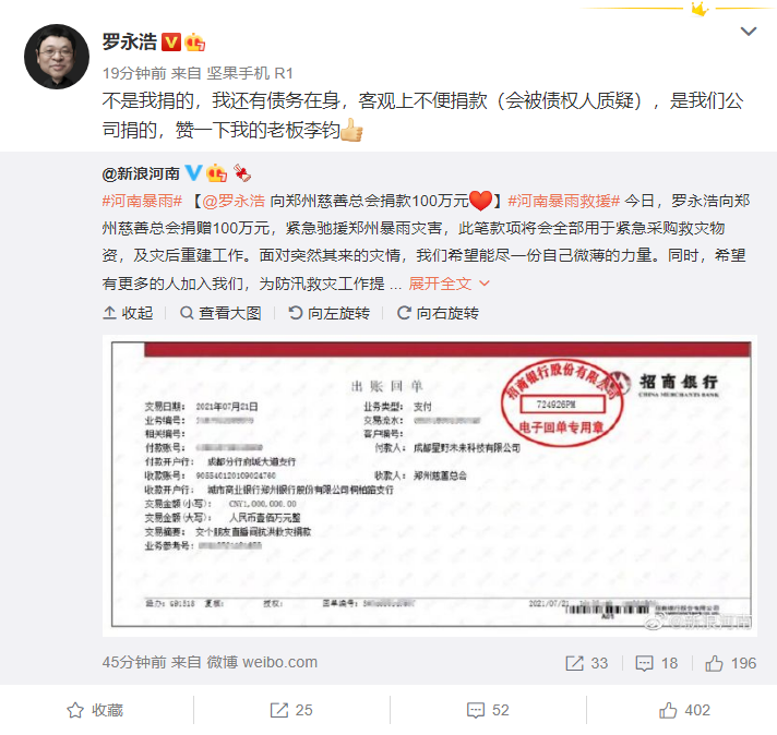 罗永浩本人在微博上回应:“不是我捐的,我还有债务在身,客观上不便捐款(会被债权人质疑),是我们公司捐的,赞一下我的老板李钧。”