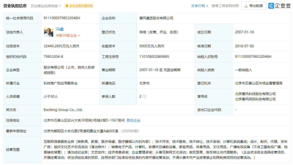 企查查显示,暴风集团股份有限公司成立于 2007 年 1 月,注册资本 3.24 亿元人民币,法定代表人冯鑫。经营范围包括互联网信息服务业务(除新闻、教育、医疗保健、医疗器械以外的内容);技术开发、技术服务、技术转让、技术咨询;计算机系统集成;设计、制作、代理、发布广告;组织文化艺术交流活动(演出除外)等。