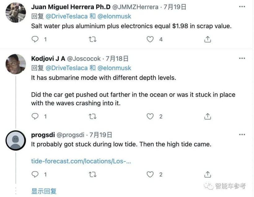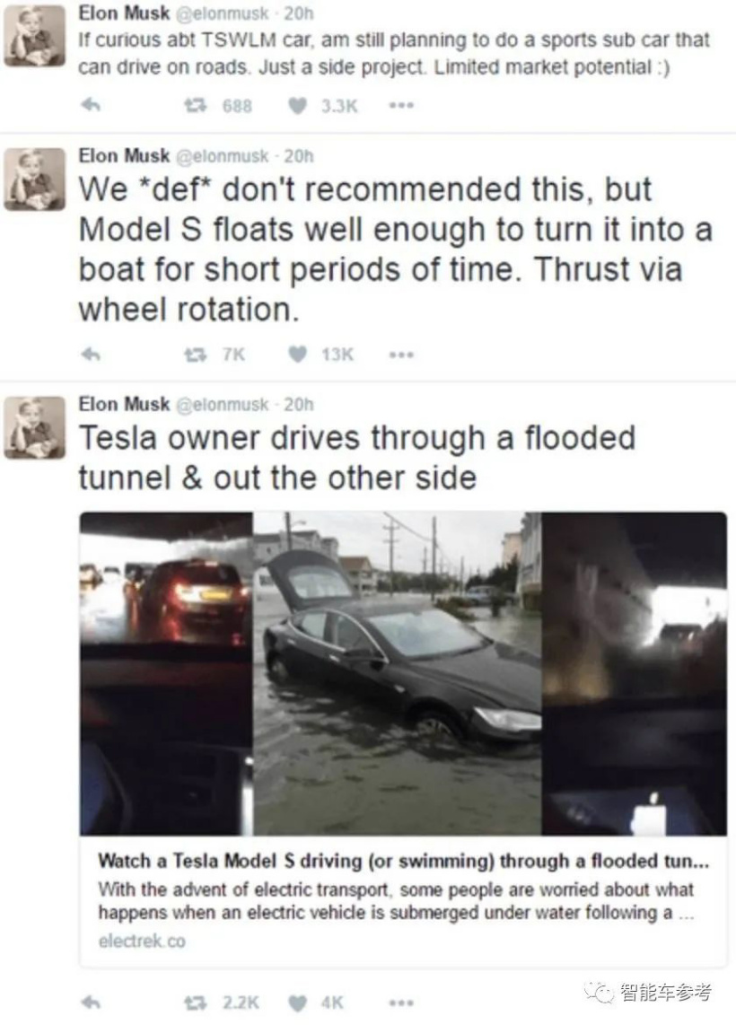 所以电动车公司,知道自家车可以当船吗?别家不知道,特斯拉的车,马斯克是表过态的:
