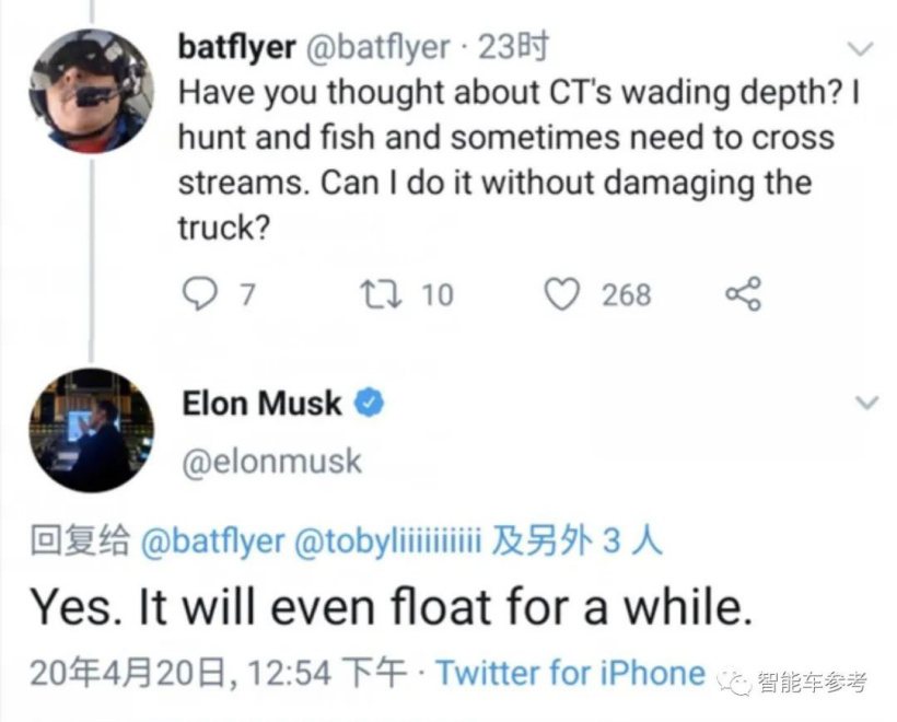 对于“涉水问题”,马斯卡还针对特斯拉皮卡 Cybertruck 是否能淌过小溪做出过回应。