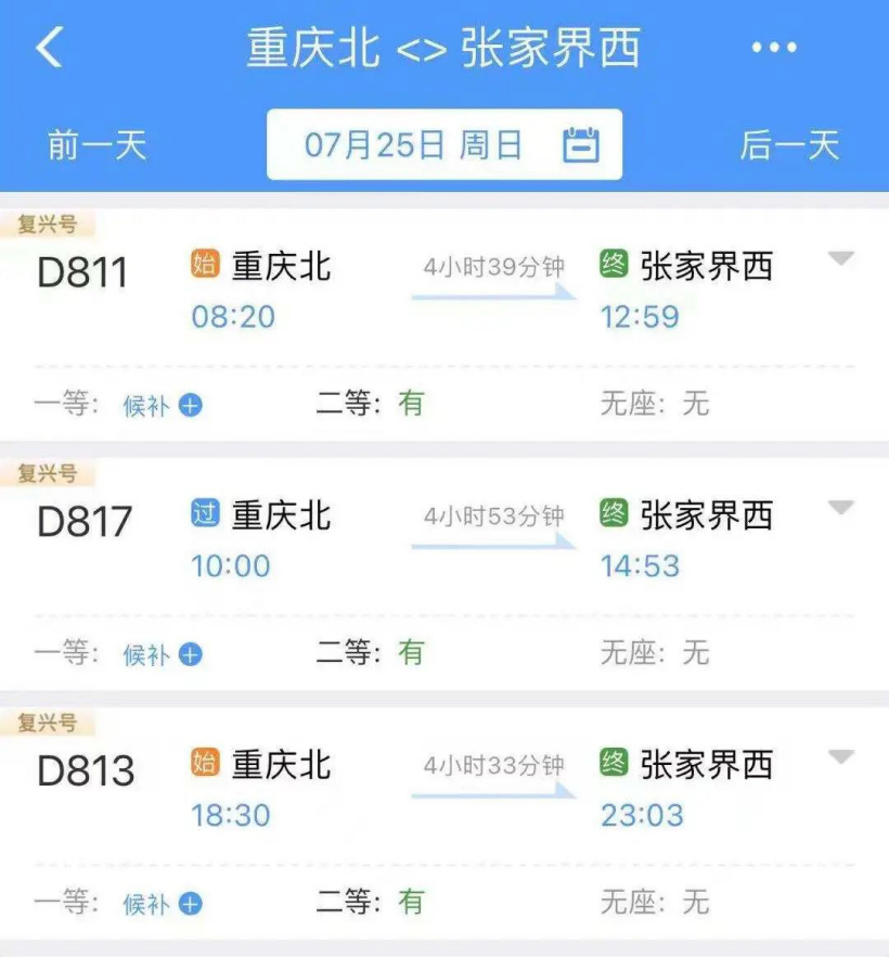 据 12306 官网显示,重庆北至张家界西间动车组列车,经由渝怀铁路、黔常铁路运行,两地旅行时间压缩至 5 小时以内。最快一趟列车仅 4 小时 33 分;成都东至张家界西间动车组列车,经由沪汉蓉铁路成遂渝段、渝怀铁路、黔常铁路运行,两地旅行时间在 7 个半小时左右。重庆北至秀山间动车组列车经由渝怀铁路运行,两地旅行时间压缩至 4 个半小时左右,最快一趟列车仅 4 小时 25 分。