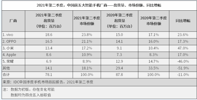 28 日消息 今日,国际数据公司(IDC)手机季度跟踪报告显示,2021 年第二季度中国智能手机市场出货量约 7810 万台,同比下降 11.0%。