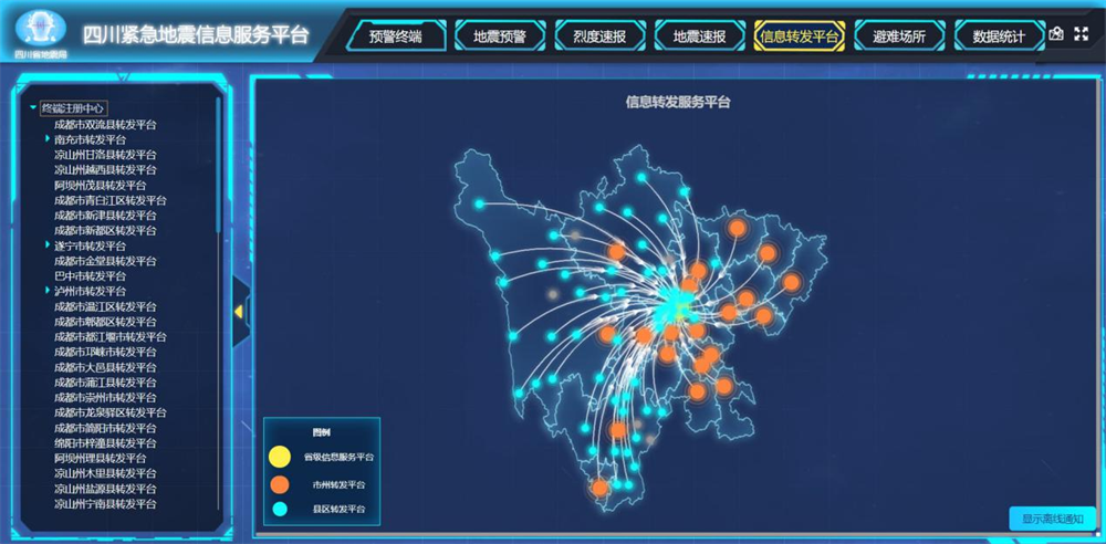 四川省地震局的地震预警系统,按照中国地震局统一部署,以“中国地震预警网”名义发布预警信息,建立了以省级预警中心、市县信息转发平台为信息发布骨干,终端、电视、广播、手机 App 为信息接收主力,同时也有支付宝、减灾所等社会企业参与。