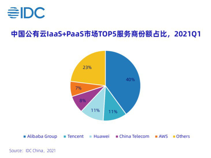 IDC 最新发布的 2021 年第一季度中国公有云市场数据显示,季度内 IaaS+PaaS 市场规模达 46.32 亿美元(301 亿人民币),其中阿里云排名第一,市场份额为 40%,腾讯云、华为云分别位列第二、三名,市场份额均为 11%。