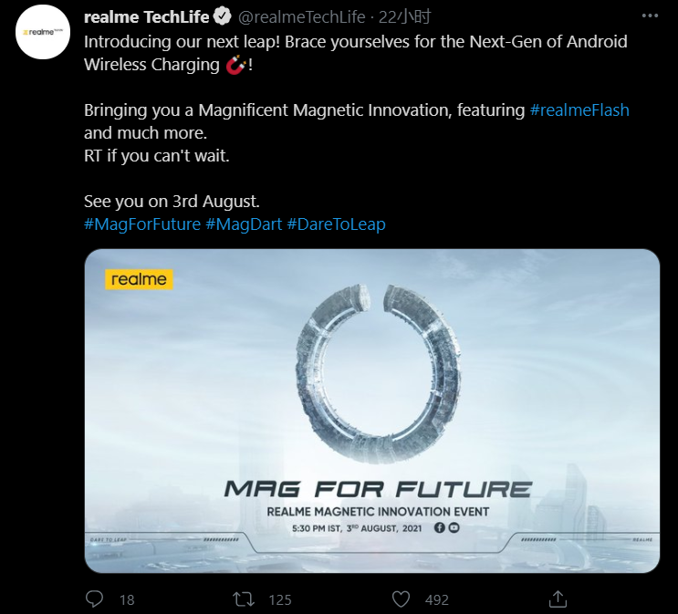 昨日,realme 官方宣布,realme 磁吸无线充电将于北京时间 8 月 3 日 20:00 发布,届时也将公布 realme Flash,并宣称是“下一代 Android 无线充电技术”。