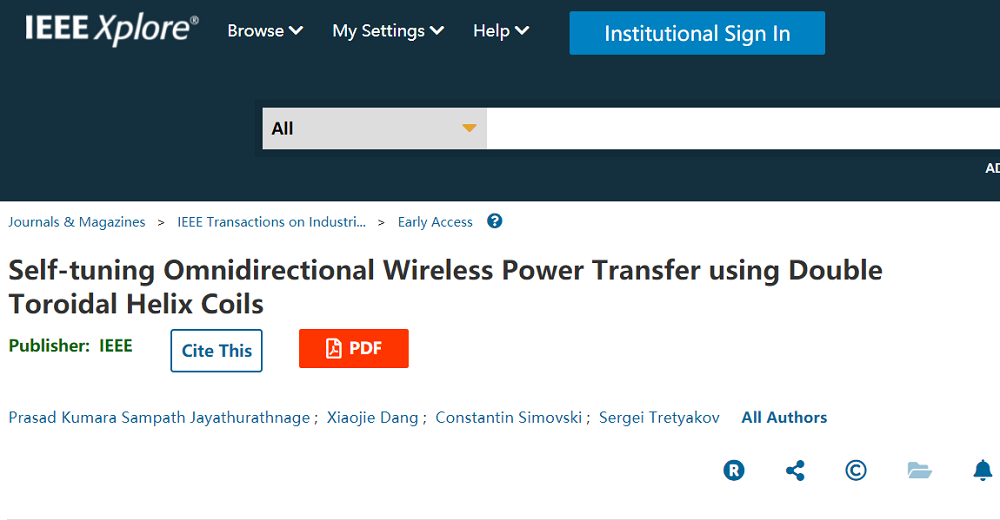 该研究论文题目为《使用双环形螺旋线圈的自调谐全向无线电力传输(Self-tuning Omnidirectional Wireless Power Transfer using Double Toroidal Helix Coils)》,于 7 月 21 日发表在 IEEE Transactions on Industrial Electronics 上。