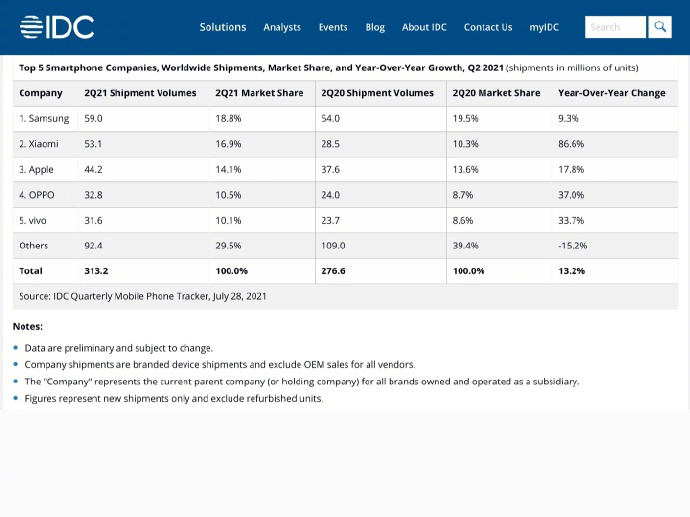 今天,IDC 发布了 2021 Q2 全球智能手机市占率排名:小米手机销量超越了苹果,首次晋升全球第二。小米 Q2 出货量 5310 万台手机,同比增长 86.6%,全球智能手机市占率达到 16.9%。