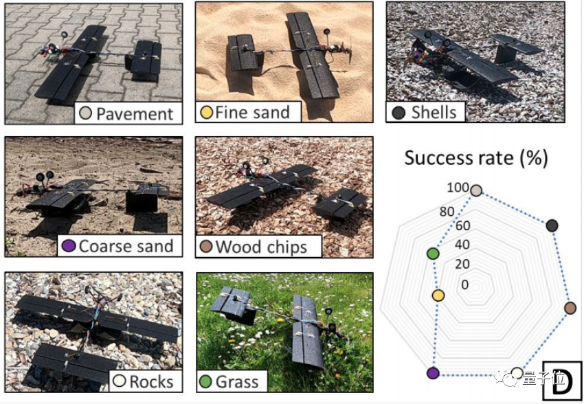从路面类型来看,这个无人机在人行道、碎石路面、洒满木屑的地面等 5 种地形上都能达到 100% 成功翻身的效果。