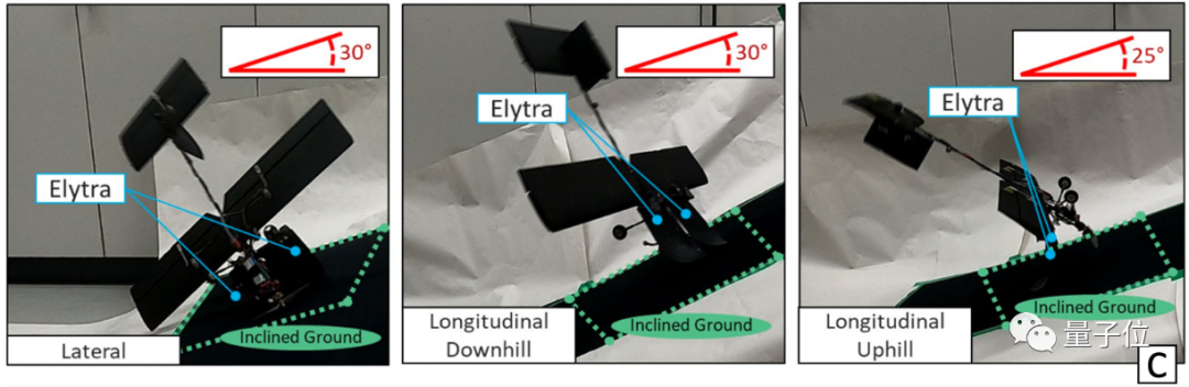 从斜坡来看,这架无人机在最高 30° 的斜坡上也能成功翻身(超过 30° 会打滑):
