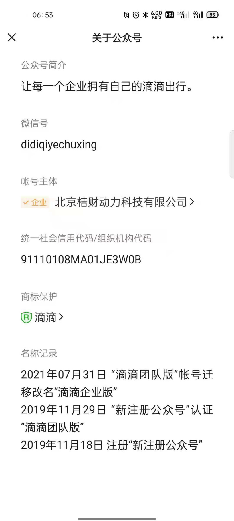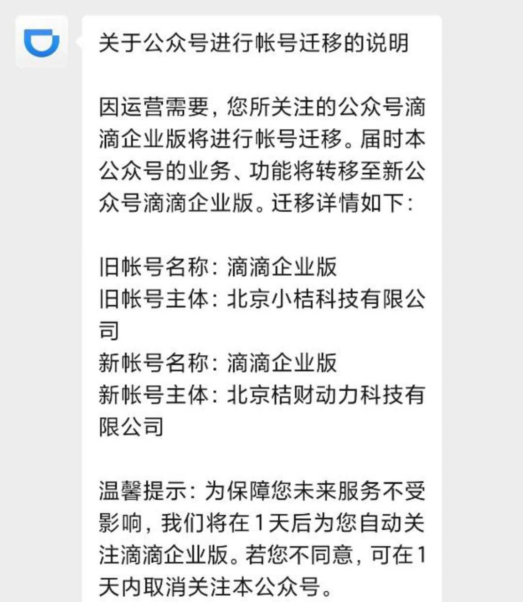友热心线索投递,滴滴企业版公众号的主体企业现从“北京小桔科技有限公司”迁移到“北京桔财动力科技有限公司”。