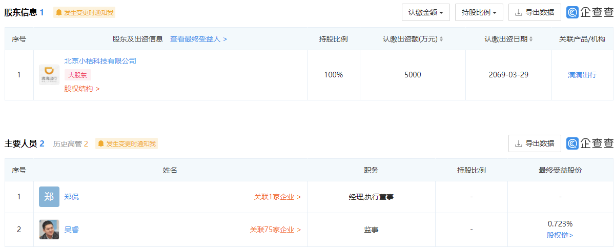 查询发现,该企业由北京小桔科技有限公司全权控股,法定代表人为郑侃,而最终受益人为程维以及王刚,