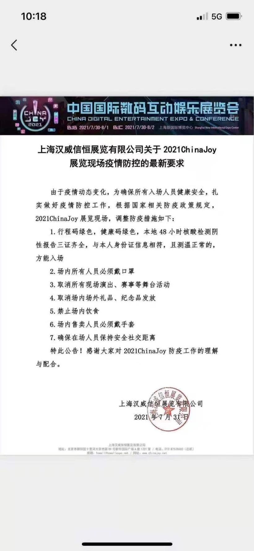 上海汉威信恒展览有限公司关于 2021ChinaJoy 展览现场疫情防控的最新要求