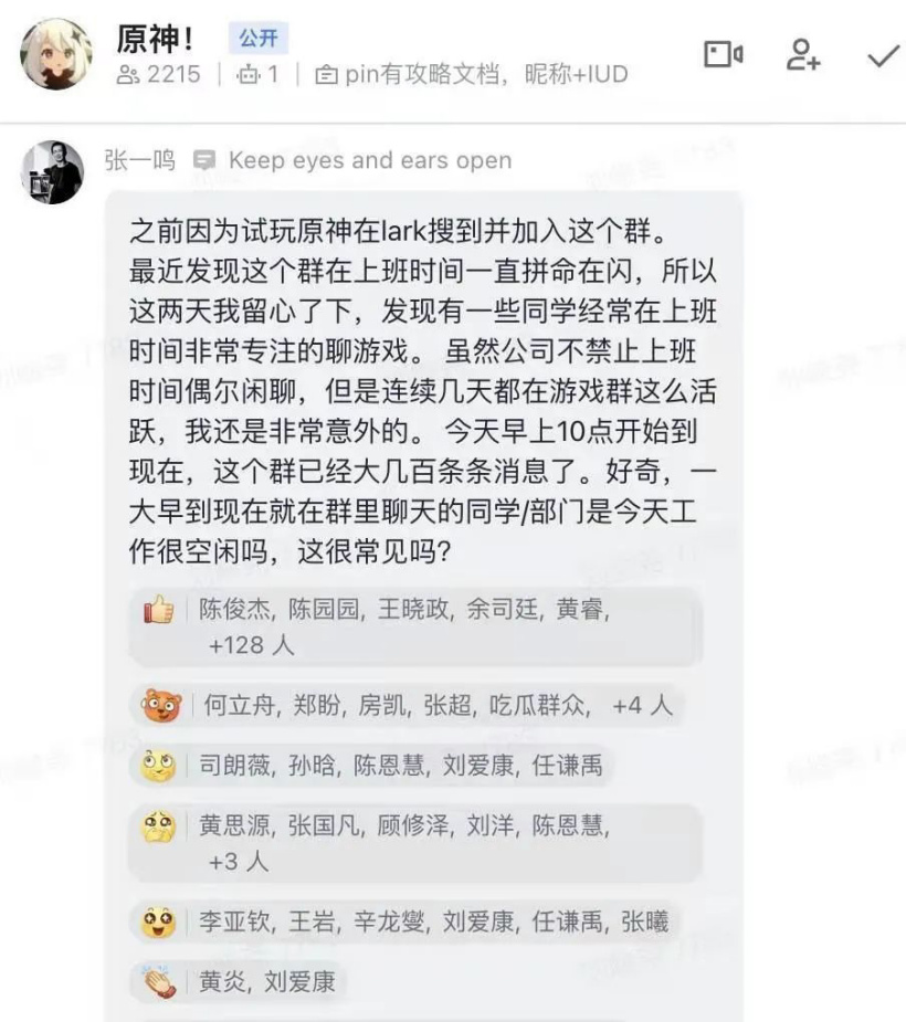作为公司的创始人,张一鸣不无担忧。典型的表现是 2020 年 12 月 8 日的「原神」事件:在偶然发现一个名叫「原神!」的飞书群里,短短一个上午产生了几百条信息后,张一鸣忍不住在群里质问:「好奇,一大早到现在就在群里聊天的同学/部门是今天工作很闲吗,这很常见吗?」