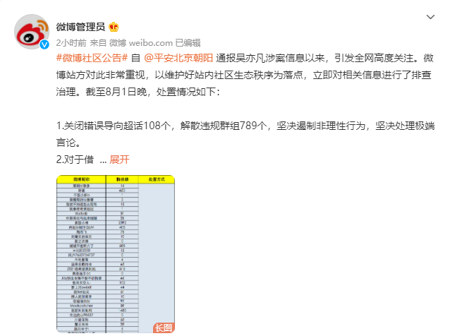 微博表示,截至 8 月 1 日晚,处置情况如下: