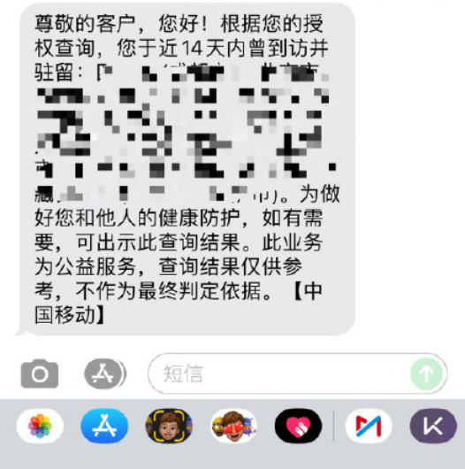 如果不能使用通信大数据行程卡,用户还可以通过发送短信来查询 14 天内到访或者驻留城市信息。中国移动发送 CXMYD 至 10086 /中国联通发送 CXMYD 至 10010/中国电信发送 CXMYD 至 10000。
