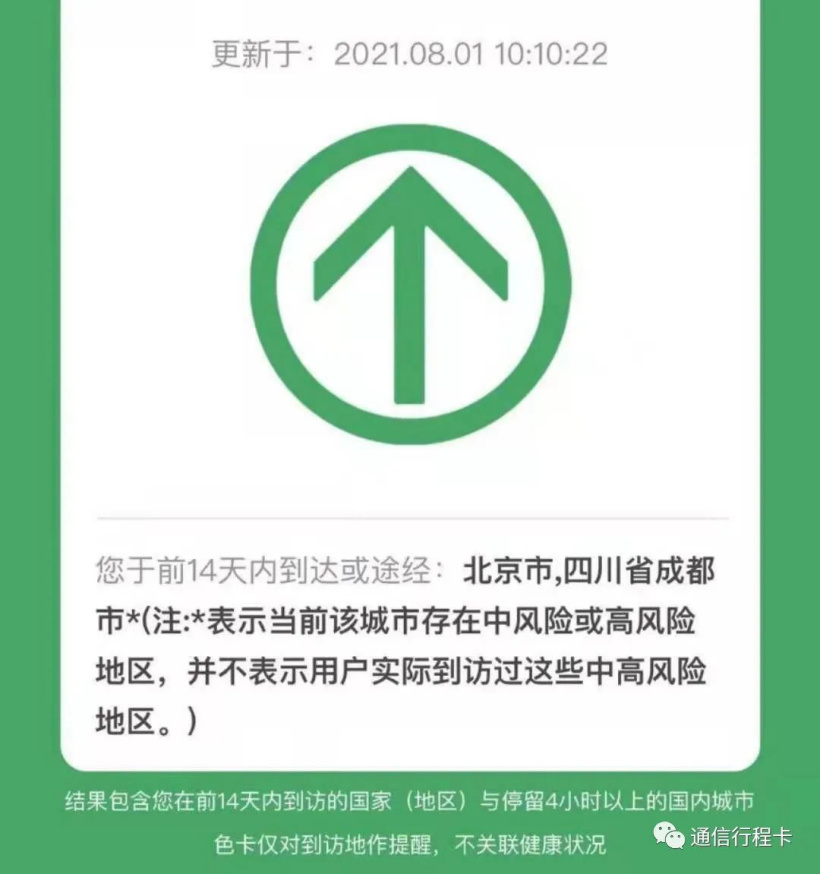 注:2021 年 1 月 8 日 20 时 30 分起,行程卡将在包含中高风险区域的城市名称后以 *(星号)标记,*(星号)标记表示用户前 14 天内到访过的该城市当前存在中风险或高风险地区,并不表示用户实际到访过这些中高风险地区。