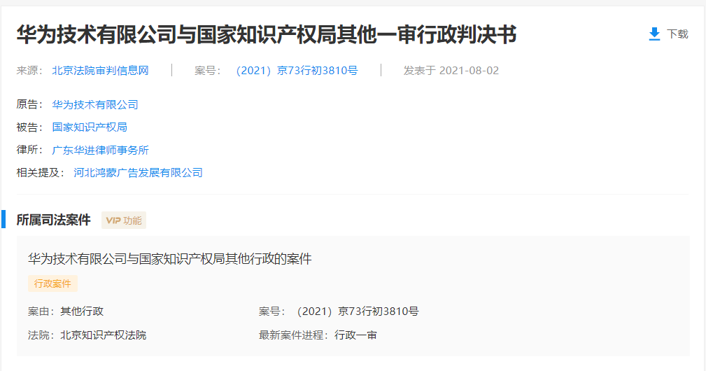 判决书显示,原告华为技术有限公司,因不服国家知识产权局做出的商评字 [2020] 第 333763 号《关于第 38684797 号“鸿蒙 HongMeng”商标驳回复审决定书》,向法院提起诉讼。
