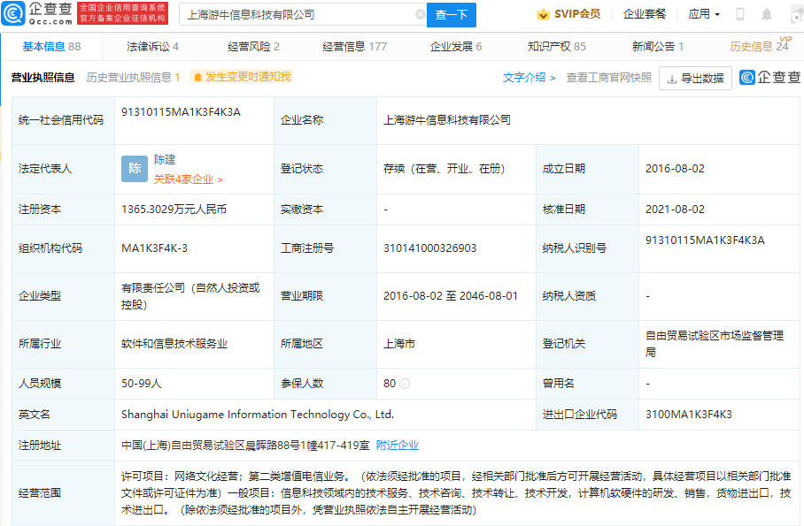 企查查信息显示,该公司成立于 2016 年,法定代表人为陈建,经营范围包含:网络文化经营;第二类增值电信业务等。据其官网显示,该公司运营心舞手游,是一款多人 3D 音乐舞蹈手游。