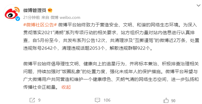 微博表示,平台始终倡导理性文明、健康向上的追星行为,并将标本兼治、积极排查治理相关问题,持续加强对“饭圈乱象”的处置力度,强化未成年人的保护措施。
