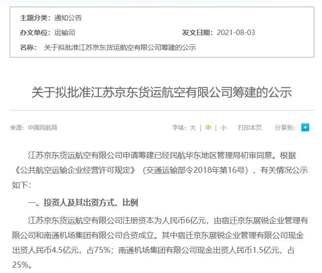 3 日消息 民航局今日发布《关于拟批准江苏京东货运航空有限公司筹建的公示》,公示称江苏京东货运航空有限公司申请筹建已经民航华东地区管理局初审同意。