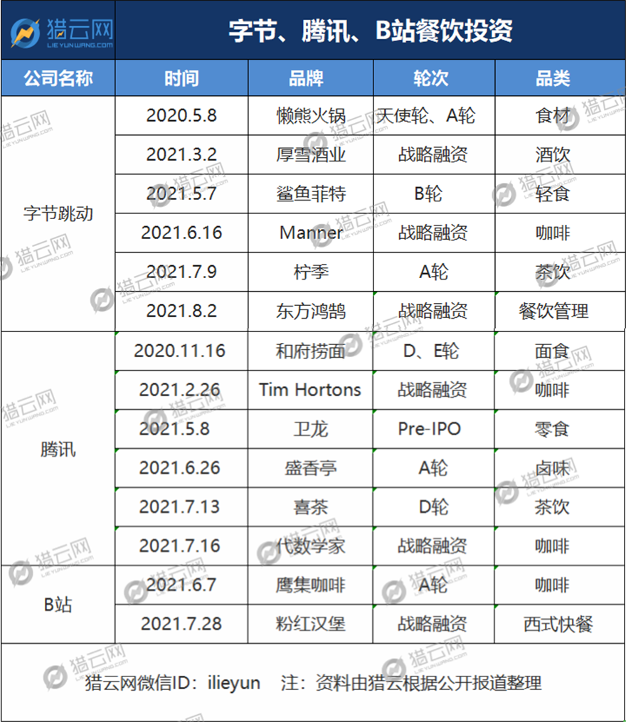 今年以来腾讯陆续出手投资了卤味快餐盛香亭、连锁中式面馆和府捞面等餐饮品牌,字节跳动也两次投资了火锅食材店懒熊火锅、轻食品牌鲨鱼菲特等餐饮品牌。近几年的餐饮热到发紫,引得互联网巨头争相布局餐饮赛道。