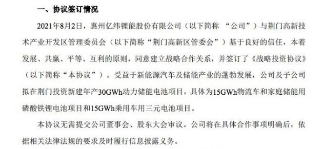 亿纬锂能今日再发公告,与荆门高新技术产业开发区管理委员会(以下简称“荆门高新区管委会”)基于良好的信任,本着发展、共赢、平等、互利的原则,同意建立战略合作关系,并签订了《战略投资协议》。