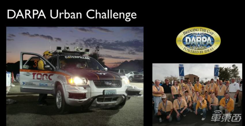 演讲中,Dennis 向听众们介绍了他的团队参加 2007 年 DARPA 城市挑战赛的故事。故事中,他们基于一辆福特 SUV 制造了一款自动驾驶汽车,这辆车能够在城市道路中自由穿梭。虽然车内还是配备了安全员,但安全员全程无需进行任何操作。按照现在的判定标准,这辆车的自动驾驶能力达到了 L4 级。