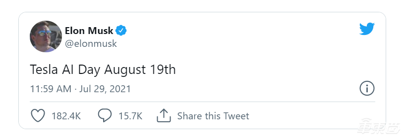 今年 7 月 29 日,马斯克在推特上表示今年的特斯拉 AI 日将在 8 月 19 日举办。
