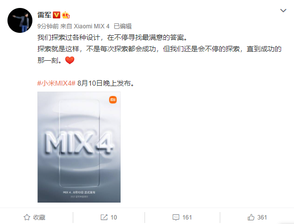 雷军今日继续为 MIX4 预热,表示小米将坚持“探索”。