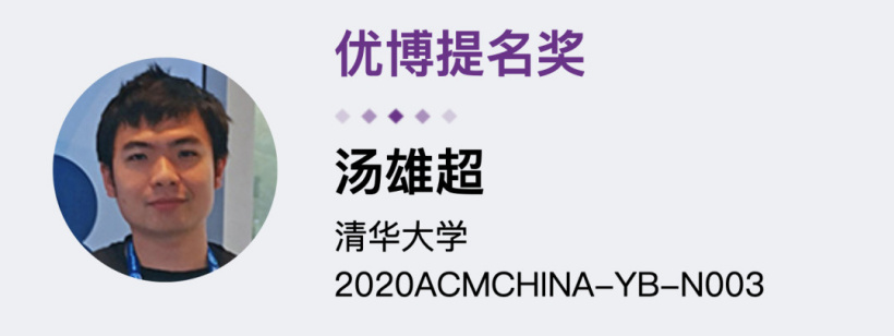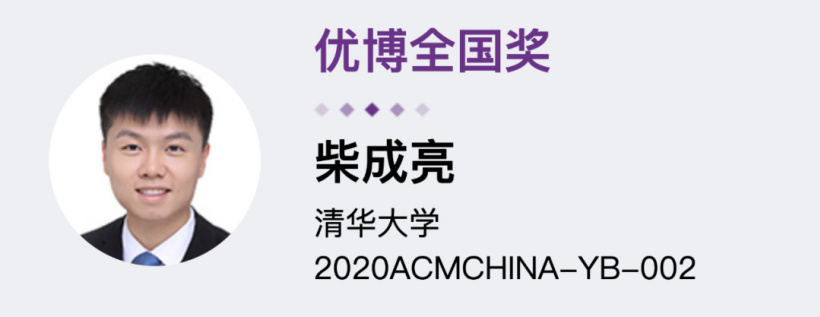 ACM 中国优秀博士论文奖为表彰在计算机科学和工程领域,由中国的学术机构授予最优秀的博士论文,以鼓励获奖者所做的专注的研究,以及取得的学术成就。从 2014 年开始,ACM 中国优秀博士论文奖每年会颁发给 1-2 篇获得认可,并且影响力大的博士论文的作者,获奖者同时会获得 1 万人民币的奖励。颁奖仪式会在次年召开的 ACM 中国图灵大会期间(今年是 2021 年 7.31 日)举行。
