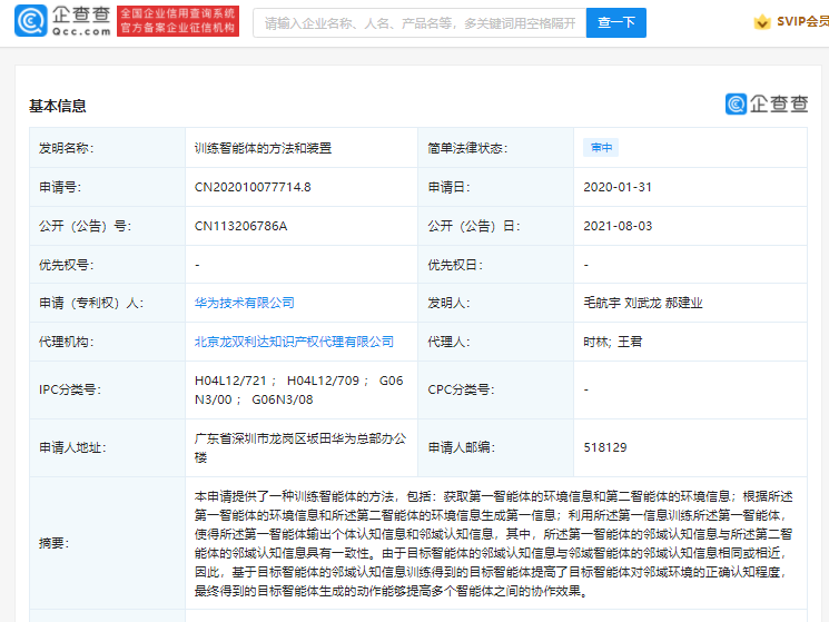 5 日消息 华为技术有限公司 8 月 3 日公开了“训练智能体的方法和装置”专利,公开号 CN113206786A。