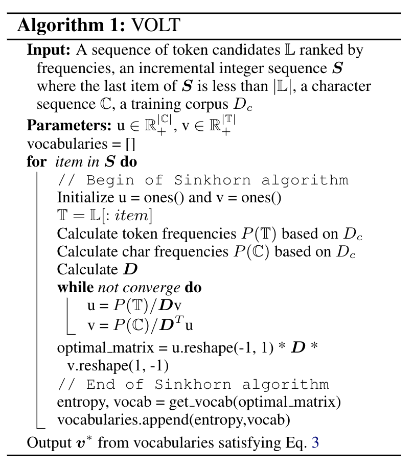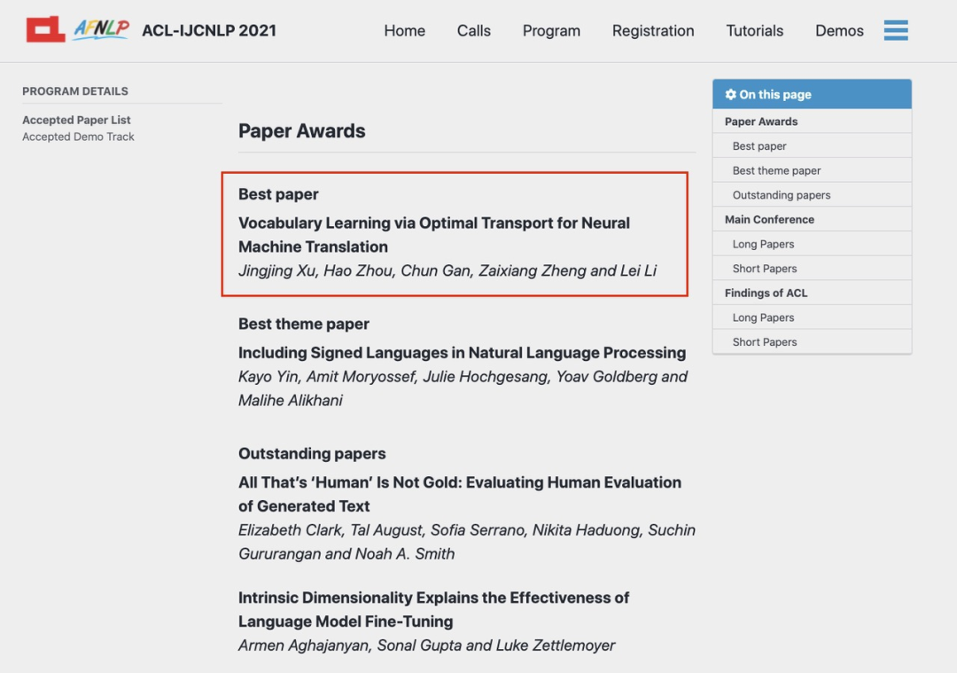 在这次 ACL 2021 获奖论文中,字节跳动技术团队提出了“面向机器翻译的最佳运输词表学习方案”(Vocabulary Learning via Optimal Transport for Machine Translation,简称 VOLT)。研究人员用经济学领域的“边际收益”定义了词表质量的评价指标,然后以数学领域的“最优运输方法”解决最优词表的生成问题。