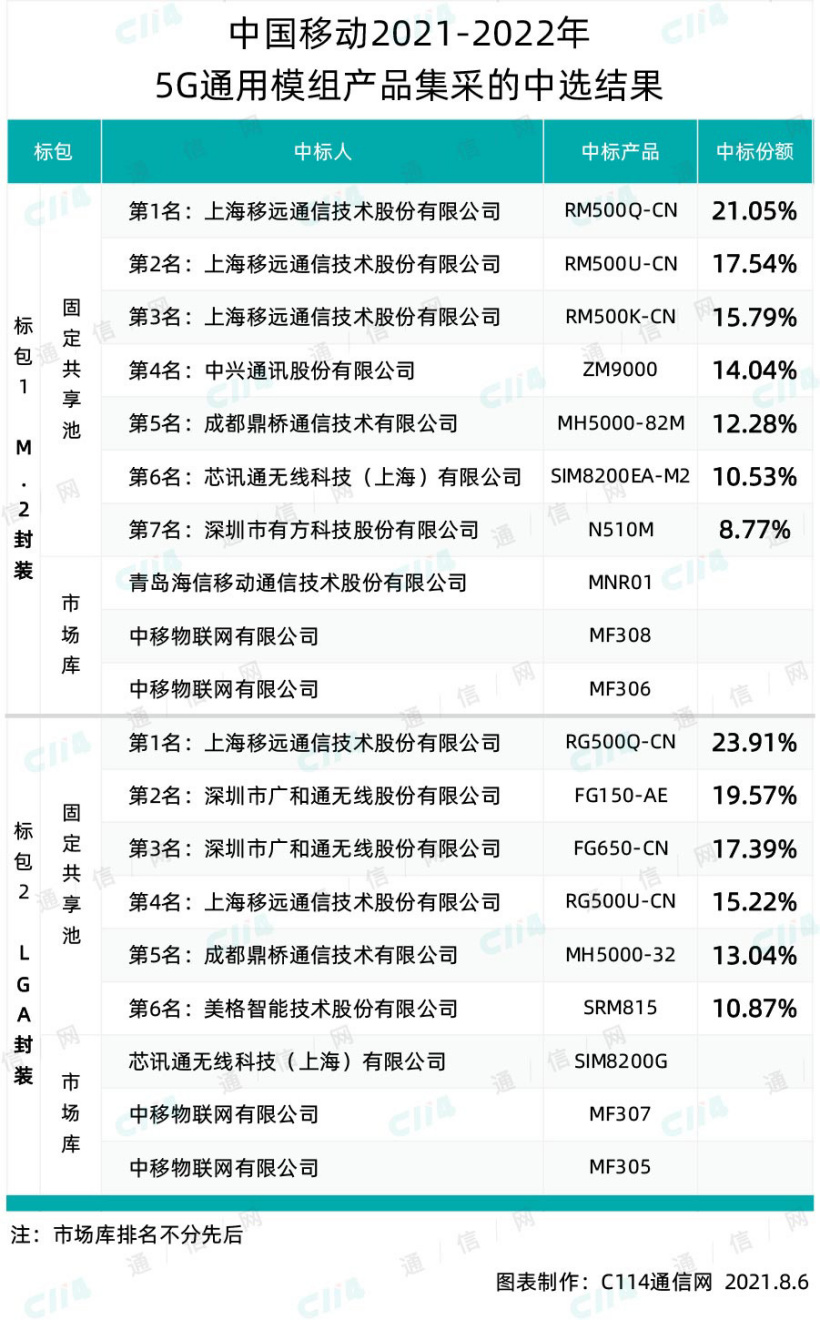 6 日消息 从中国移动官网获悉,中国移动今天公示了 2021-2022 年 5G 通用模组产品集采的中标结果,上海移远、中兴、鼎桥等 9 家企业中标。