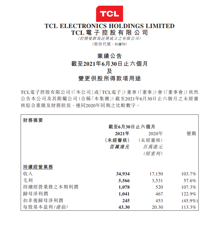 6 日消息 TCL 电子在今日公布 2021 年上半年报,数据显示,截至 2021 年 6 月 30 日,公司上半年收入 349.3 亿港元,同比增长 103.7%;归母净利润 10.41 亿港元,同比增长 122.9%。