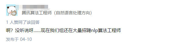 在需求侧,一位腾讯算法工程师的答主表示,他们组正在招聘 NLP 算法工程师: